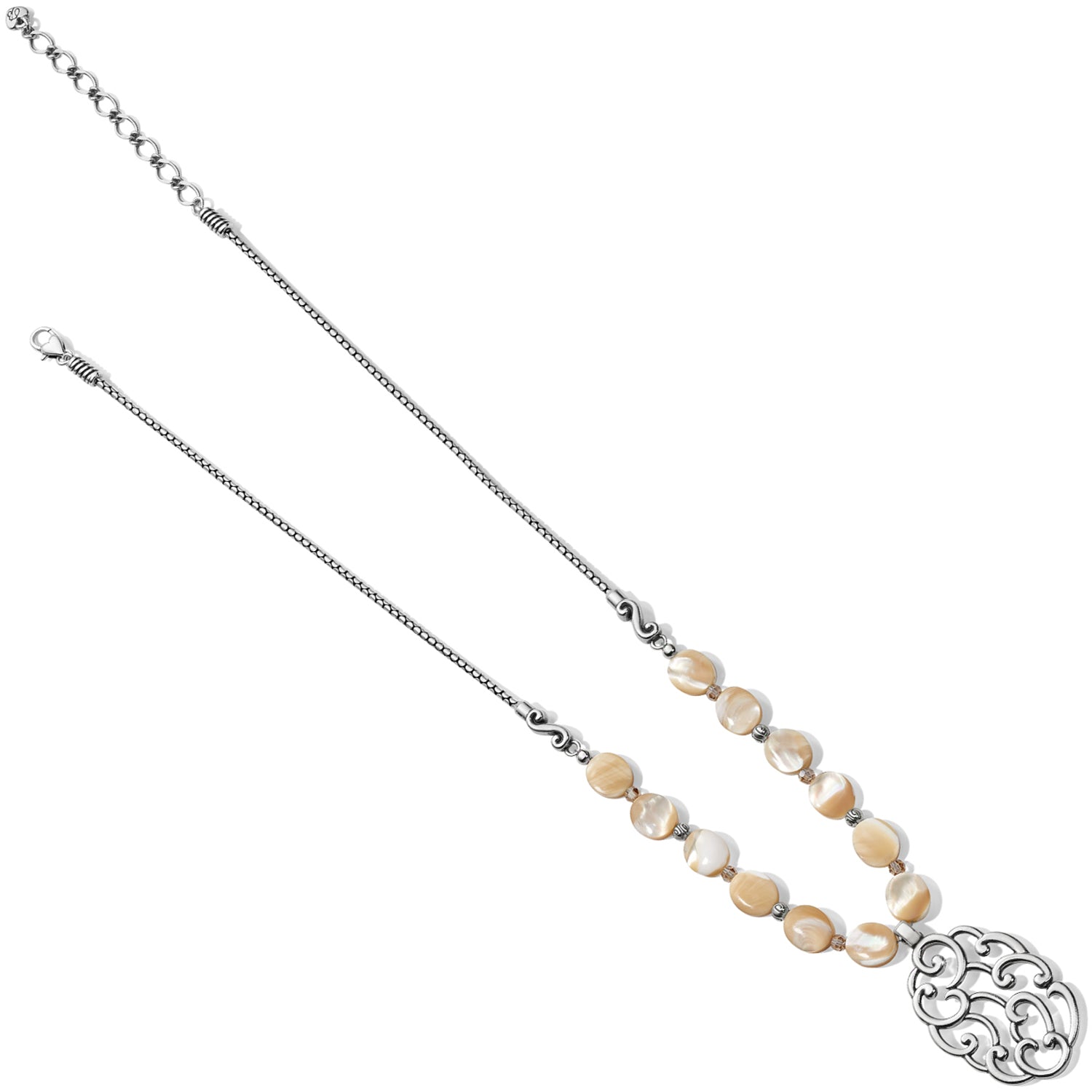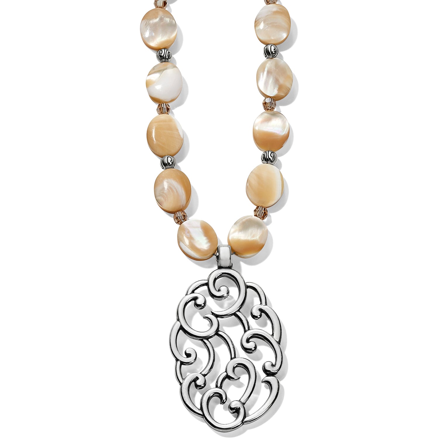A dramatic oval pendant with airy swirls hangs from this long silver necklace adorned with Mother of Pearl beads in a warm, natural tan hue. In between, faceted Swarovski crystals and etched silver beads add visual interest.