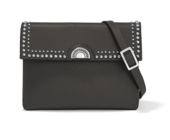 The perfect little companion for a night out or running errands, its flap is decorated with a cool double row of studs and 1/2 moon hardware. It has a back pocket and a removable crossbody strap with the option to wear as a clutch or toss into a tote bag.