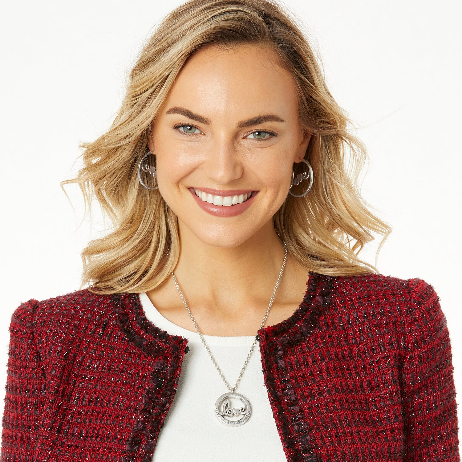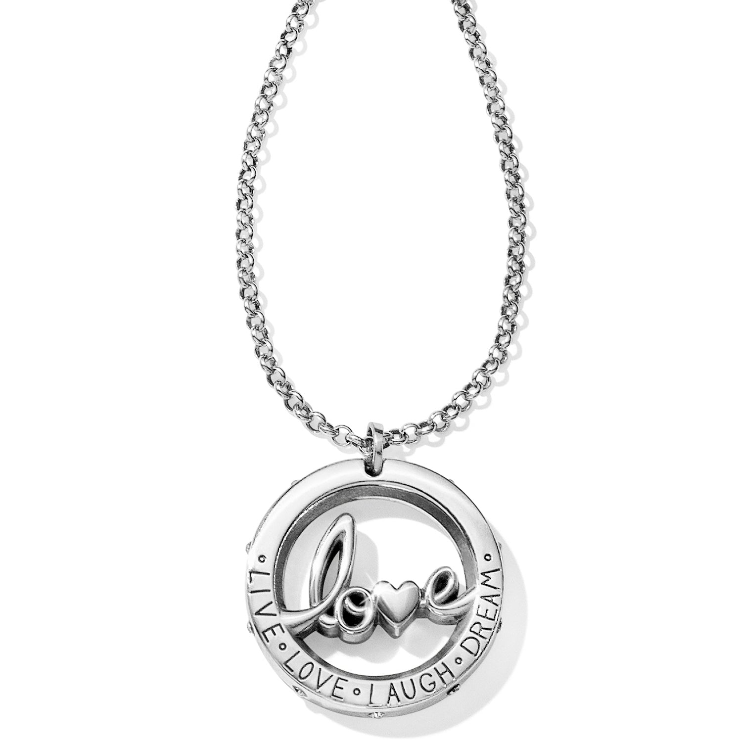 Perfect for gifting, this lovely pendant spells out love in lowercase letters. It's fresh, fun, and fashionable! Underneath, it reads, Live, Love, Laugh, Dream.