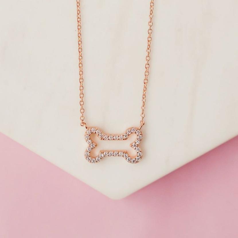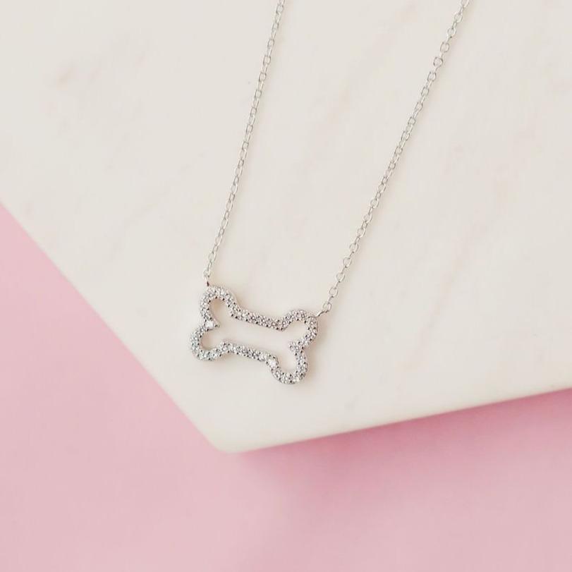 The perfect gift for the dog mom in your life. A dainty, pavé dog bone necklace with white cubic zirconia detail.