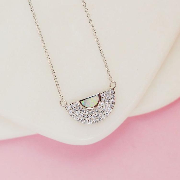 Three rows of glittering, pavé set white cubic zirconia stones surround a glowing half circle of white opal. This necklace is Modern and stylish and the *perfect* dainty statement piece that you can wear solo or layered with another necklace in the Chloe + Lois collection.