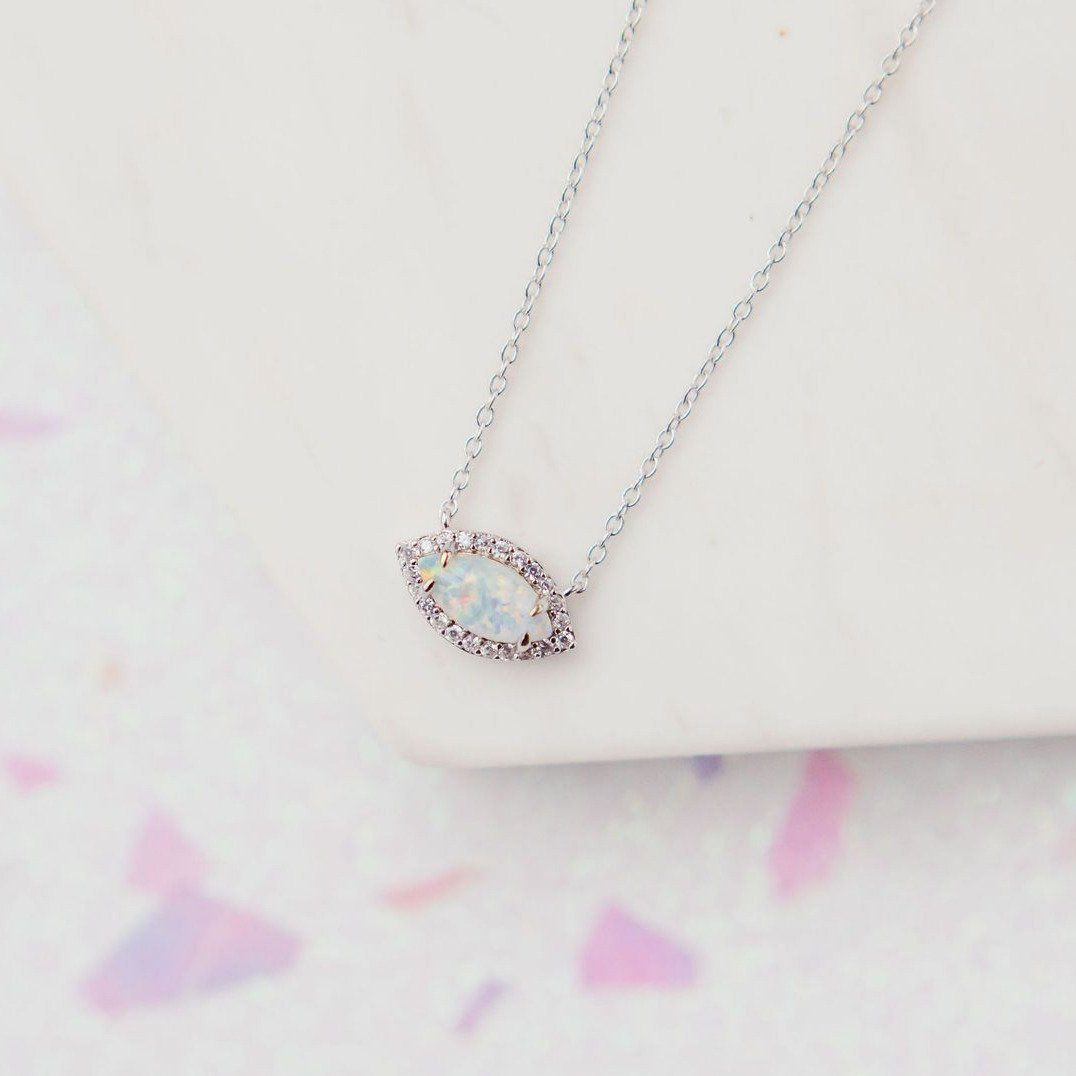 Our twist on an evil eye necklace. White opal shimmers and wards of all evil in this beautiful, dainty necklace.