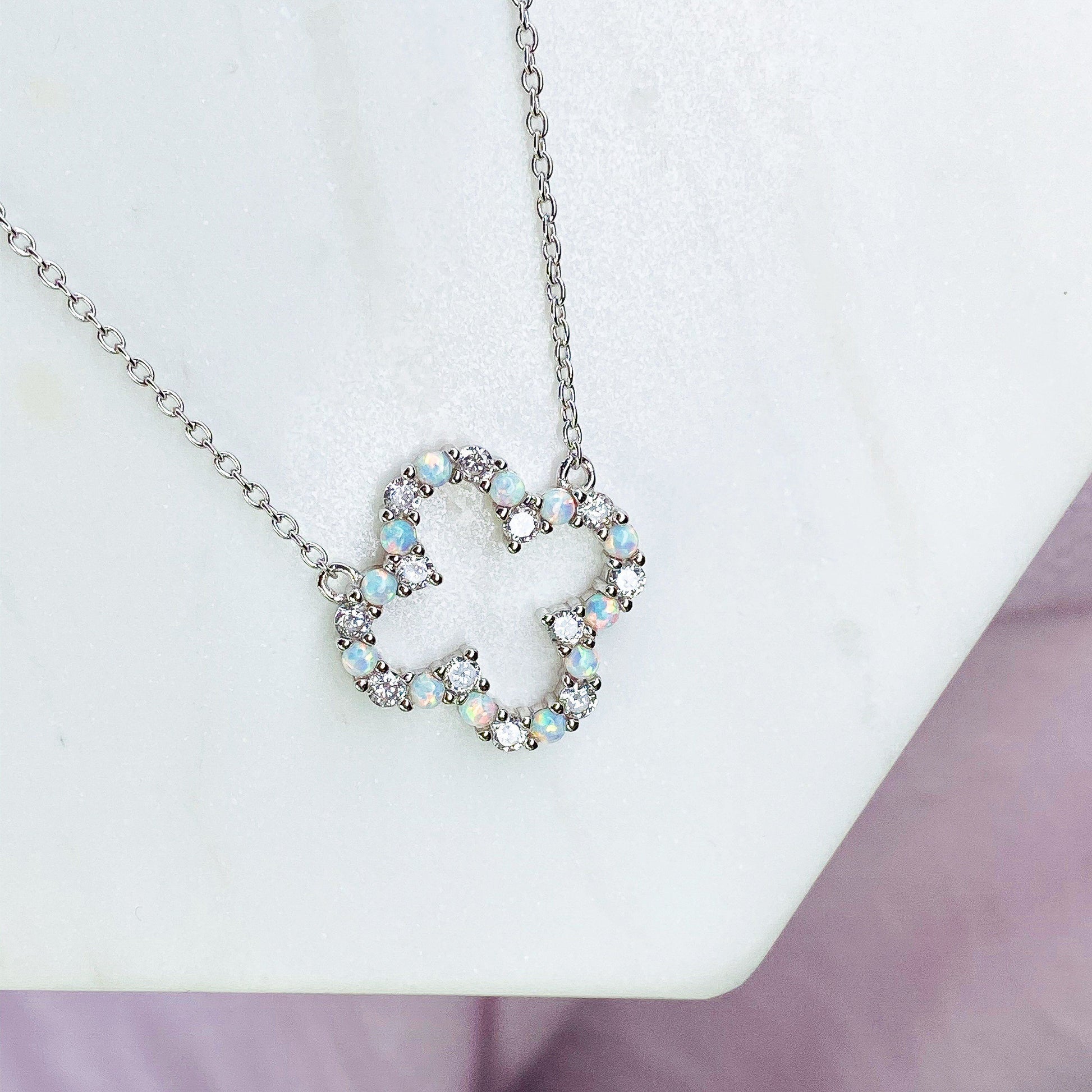 A play on my best selling "Infinity" necklace, the "Infinity" Clover is classy and sassy. White, prong set glowing opals and white cubic zirconia stones are joined together to form a clover shape that you're going to love to wear (and get compliments on!)