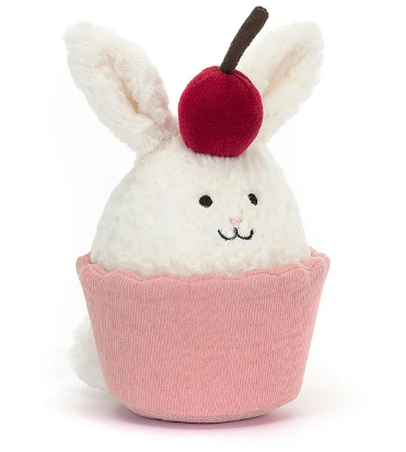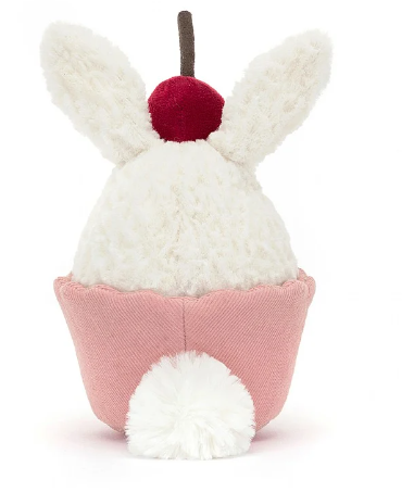 The Dainty Dessert Bunny Cupcake is gorgeously mixed-up. Inside that pink fine cord cake case there's a soft cream bunny masquerading as a treat! This long-eared bunny has textured fur and wears a bold cherry hat. There's even a bobtail peeping out! A cute gift.