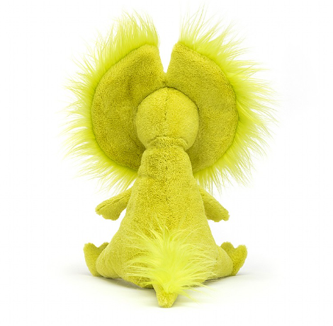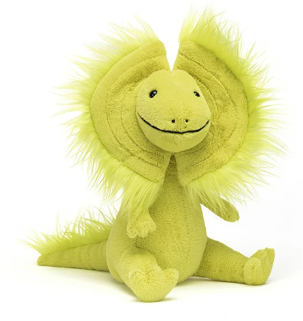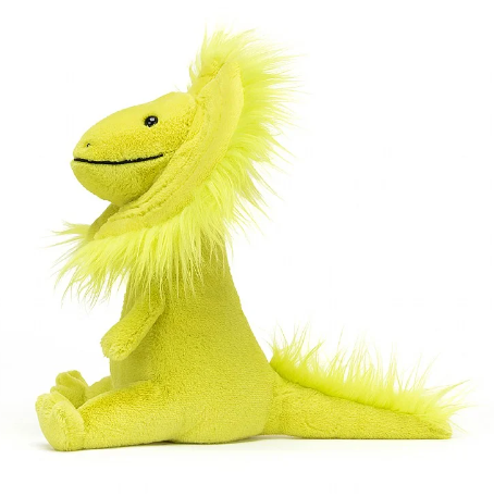 Goofy-gorgeous in zingy citrus green, it's Davey Dilophosaurus! This sassy scrambler has a very fine frill with stitchy ring detail and fluffy edging. A bright-eyed bestie with a huge dorky smile, long fuzzy tail and diddy paws, Davey's downright reptastic!