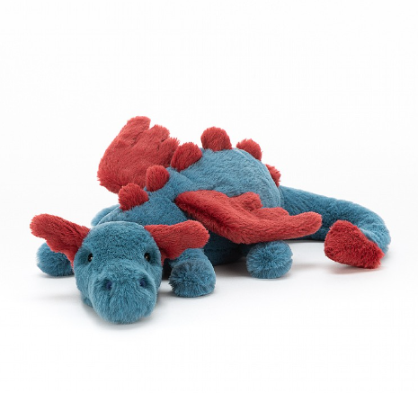 Most dragons are fiery, but Dexter Dragon is flopsy! No scales for this scamp - just snugglesoft fur in chalky blue and warm maroon red. Gorgeously detailed with soft horns, stitched wings, a pointy tail tip and knobbly spines, this dreamy dragon gives monster hugs!