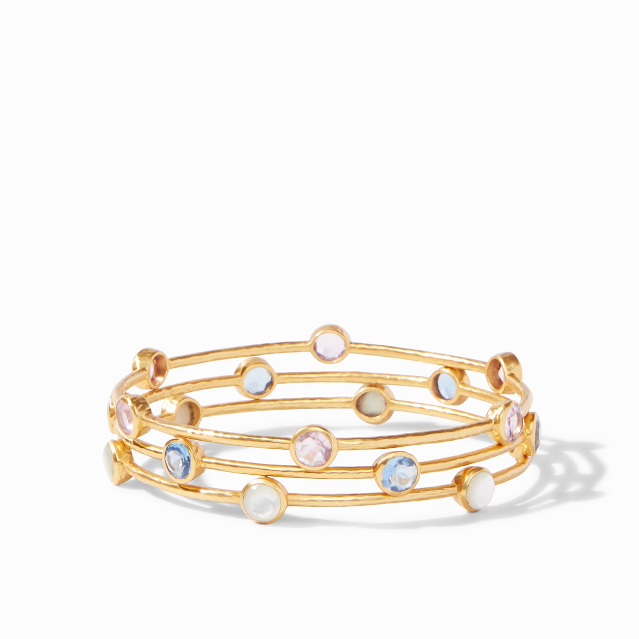 A lightly hammered bangle embellished with six sparkling gemstones. Pearl, imported glass, semi-precious stones, composed turquoise.